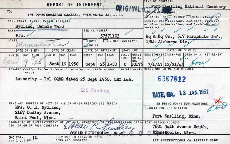 marker for Dennis W. Mydland in Section C, Grave 10175 of the
