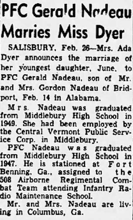 SALISBURY, Feb. 26 Mrs. Ada Dyer announces the marriage of her youngest daughter, June, to PFC Gerald Nadeau, son of Mr. and Mrs. Gordon Nadeau of Bridport, Feb. 14 in Alabama.}