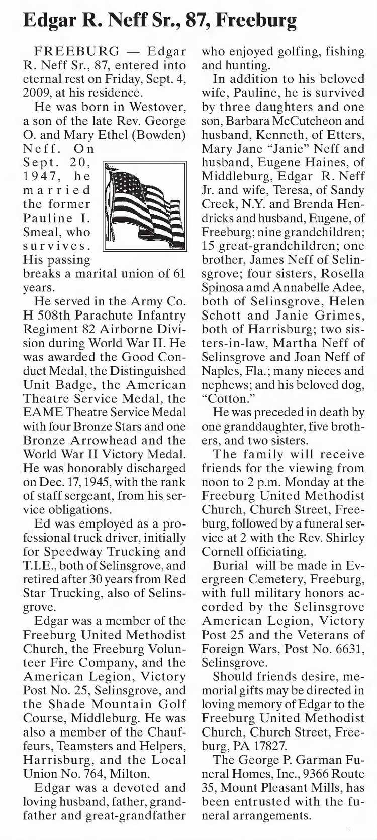 Edgar R. Neff Sr., 87, entered into eternal rest on Friday, Sept. 4, 2009, at his residence.