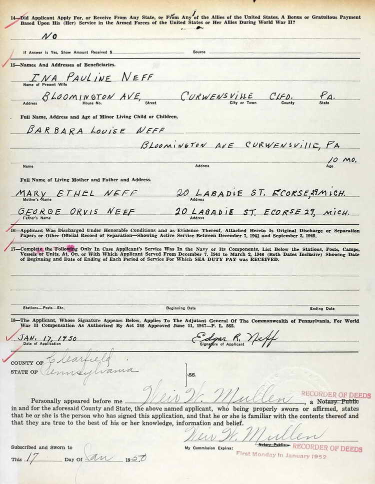 application for the Pennsylvania WWII Veterans bonus. on 17 January