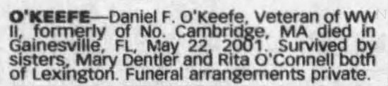O'KEEFE Daniel F. O'Keefe. Veteran of WW II. formerly of No. Cambridge, MA died in