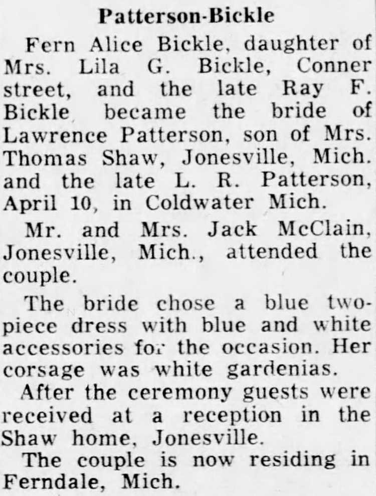 Fern Alice Bickle, daughter of Mrs. Lila G. Bickle, Conner street, and the late Ray F. Bickle. became the bride of Lawrence Patterson, son of Mrs. Thomas Shaw, Jonesville, Mich, and the late L. R. Patterson, April 10, in Coldwater Mich.
