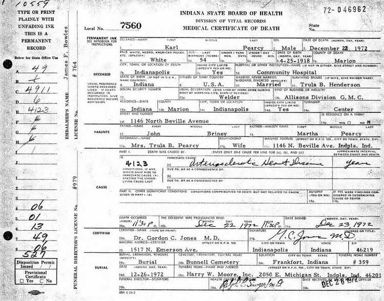 for Karl E. Pearcy in Bunnell Cemetery, Frankfort (Clinton county),