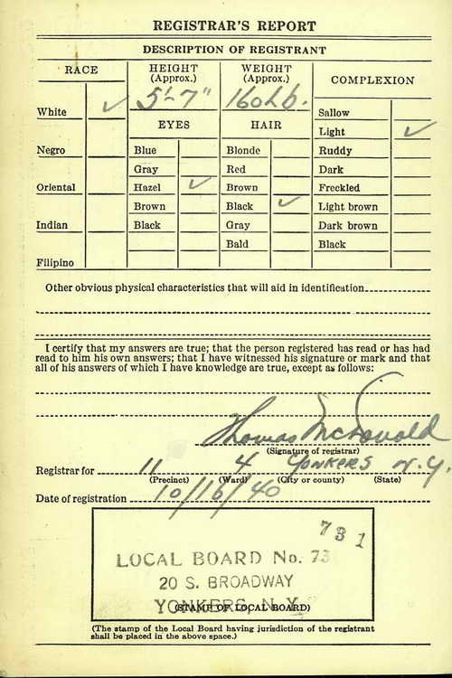 the draft in Yonkers, NY on 16 Octobne 1940 and was inducted into the Army at Monterey,