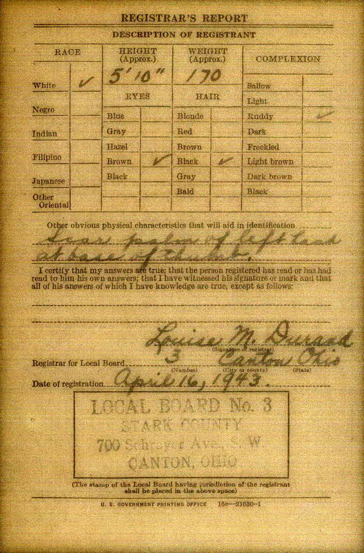 draft on 16 April 1943 in Canton, OH and ws inducted into the Army at