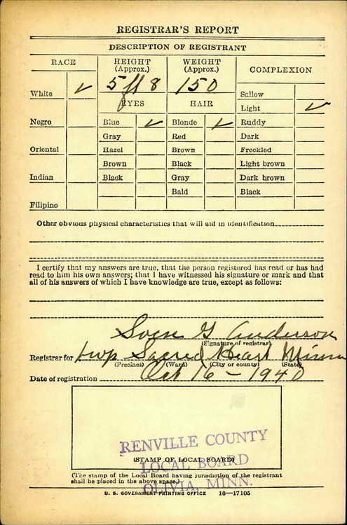 draft in Olivia, Minnesota on 16 October 1940. He was inducted