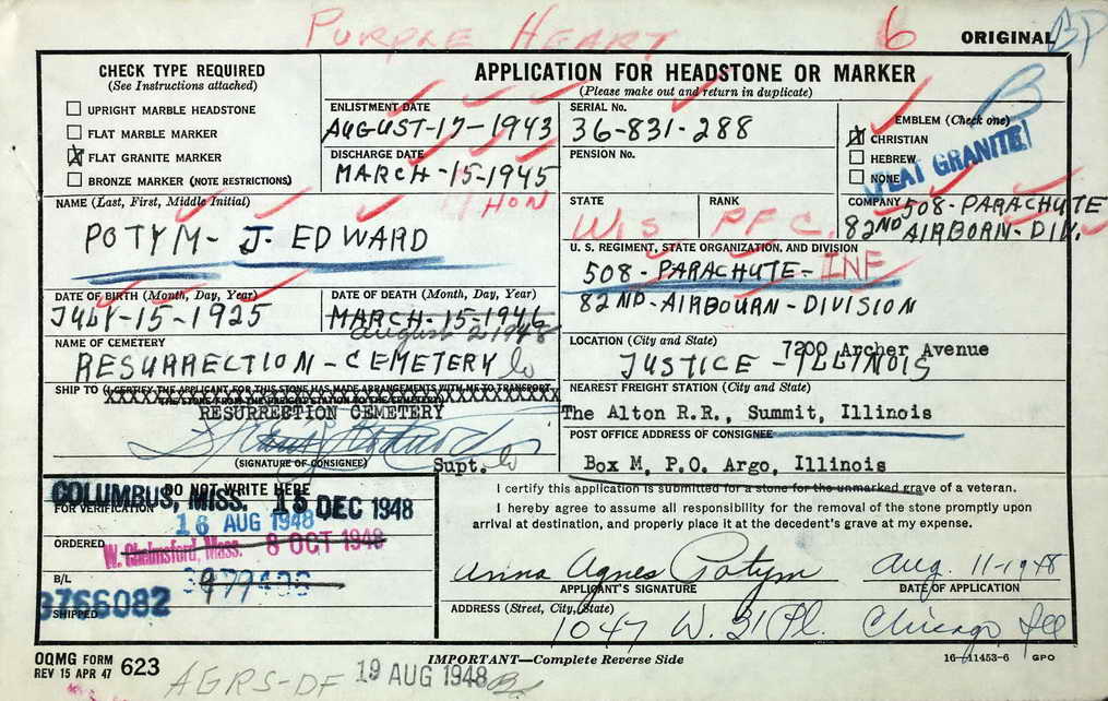 Application for grave marker for Edward J. (J. Edward?) Potym to be