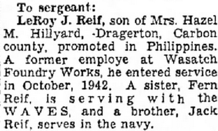 LeRoy J. Reif, son of Mrs. Hazel M. Hillyard, Dragerton, Carbon county,