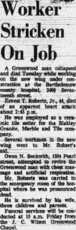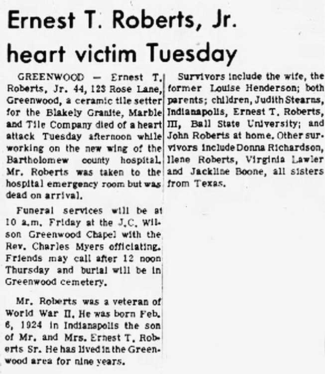 GREENWOOD Ernest T Roberts, Jr. 44, 123 Rose Lane, Greenwood, a ceramic tile setter for the Blakely Granite, Marble and Tile Company died of a heart attack Tuesday afternoon while working on the new wing of the Bartholomew county hospital. Mr. Roberts was taken to the hospital emergency room but was dead on arrival.