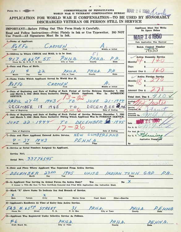 for the Pennsylvania WWII Veterans Bonus. He was credited with 14