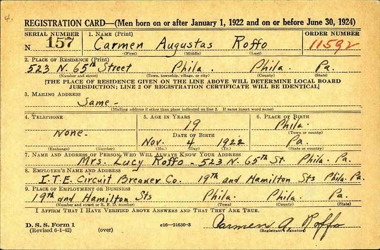 A. Roffo registered for the draft ca 1941 and was inducted into the Army