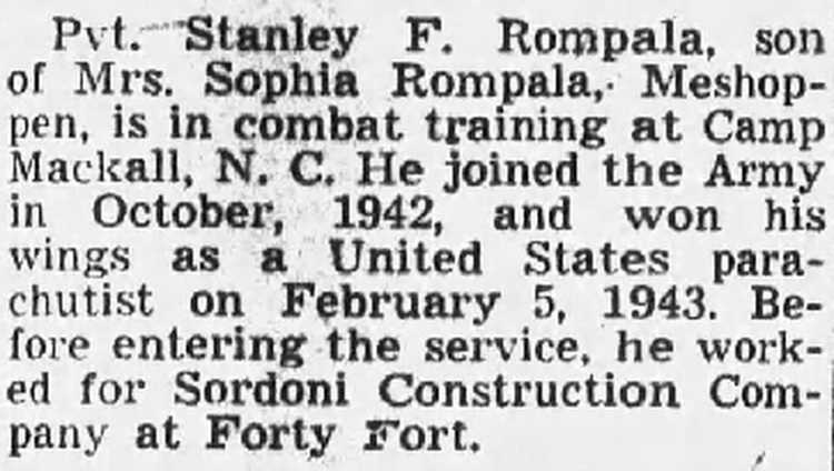 Pvt Stanley F. Rompala, son of Mrs. Sophia Rompala,