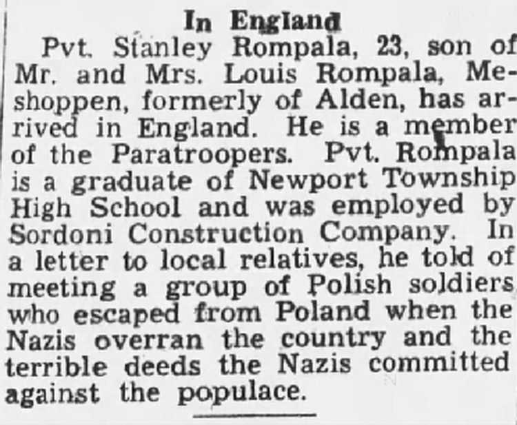 Rompala, Meshoppen, formerly of Alden, has arrived in England. He is a member of the Paratroopers. Pvt. Rompala is