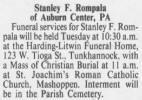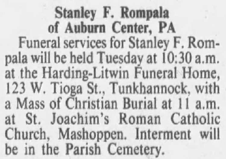 Stanley Rompala, 69, of Auburn Center, RD 3. Meshoppen, died