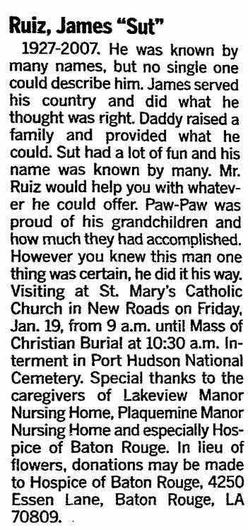 Sut had a lot of fun and his name was known by many. Mr. Ruiz would help you with whatever he could offer. Paw-Paw was proud of his grandchildren and how much they had accomplished. However you knew this man one thing was certain, he did it his way.