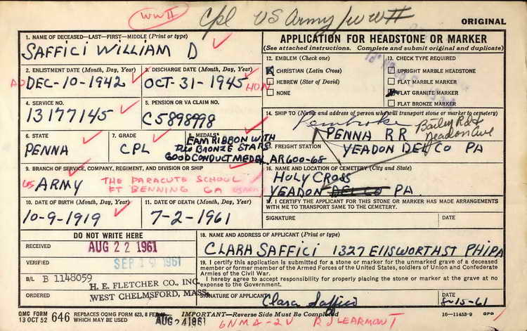 William D. Saffici enlisted in the Army on December 10, 1942