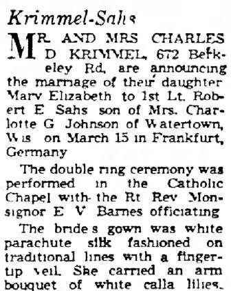 married Marine Corps Sergeant May Elizabeth Krimmel.