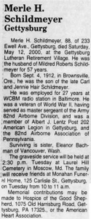 Gettysburg Merle H. Schildmeyer, 88, of 233 Ewell Ave., Gettysburg, died Saturday, May 12, 2000, at the Gettysburg Lutheran Retirement Village. He was (the husband of Mildred Roberts