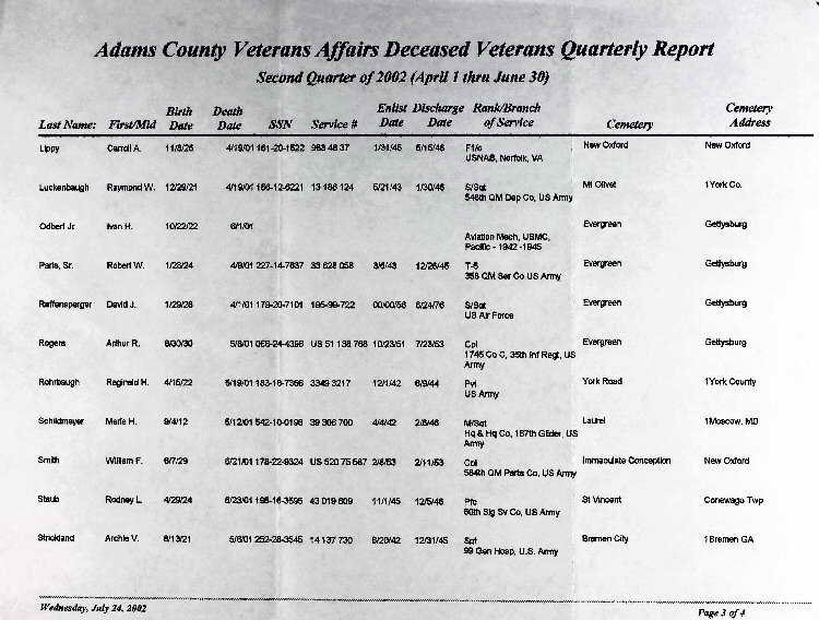 Adams county, Pennsylvania Veterans Affairs Deceased
