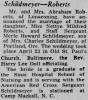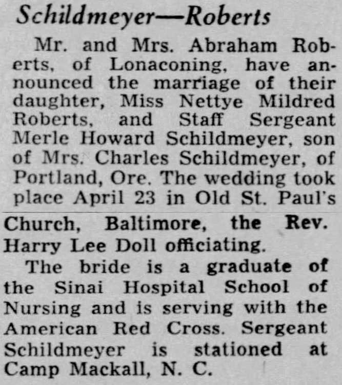 Mr. and Mrs. Abraham Roberts, of Lonaconing, have announced the marriage of their daughter, Miss Nettye Mildred Roberts, and Staff Sergeant Merle Howard Schildmeyer, son of Mrs. Charles Schildmeyer, of Portland, Ore. The wedding took place April 23 in Old St. Paul's Church, Baltimore, the Rev. Harry Lee Doll officiating. The bride is a graduate of the Sinai Hospital School of Nursing and is serving with the American Red Cross. Sergeant Schildmeyer is stationed at Camp Mackall, N. C.