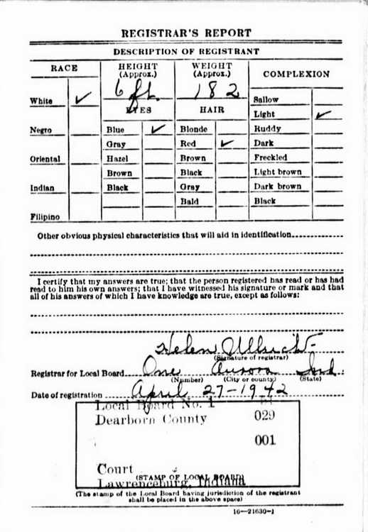 He registered for the draft on 27 April 1942 at Aurora, IN. He