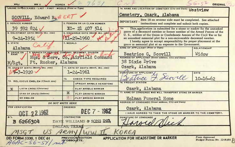 Marker and resulting grave marker for Edward R. Scovill in Westview