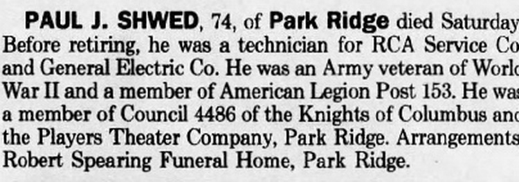 PAUL J. SHWED, 74, of Park Ridge died Saturday. Before retiring, he was a technician for RCA Service Co. and General Electric Co. He was an Army veteran of World War II and a member of American Legion Post 153. He was a member of Council 4486 of the Knights of Columbus and the Players Theater Company, Park Ridge. Arrangements: Robert Spearing Funeral Home, Park Ridge. [The Record, Hackensack, NJ, 30 Dec 2001,