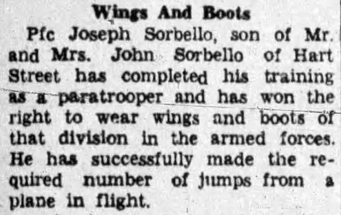 Mrs. John Sorbello of Hart Street has completed his training as a paratrooper and has won the right to wear wings and boots