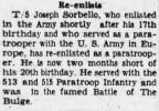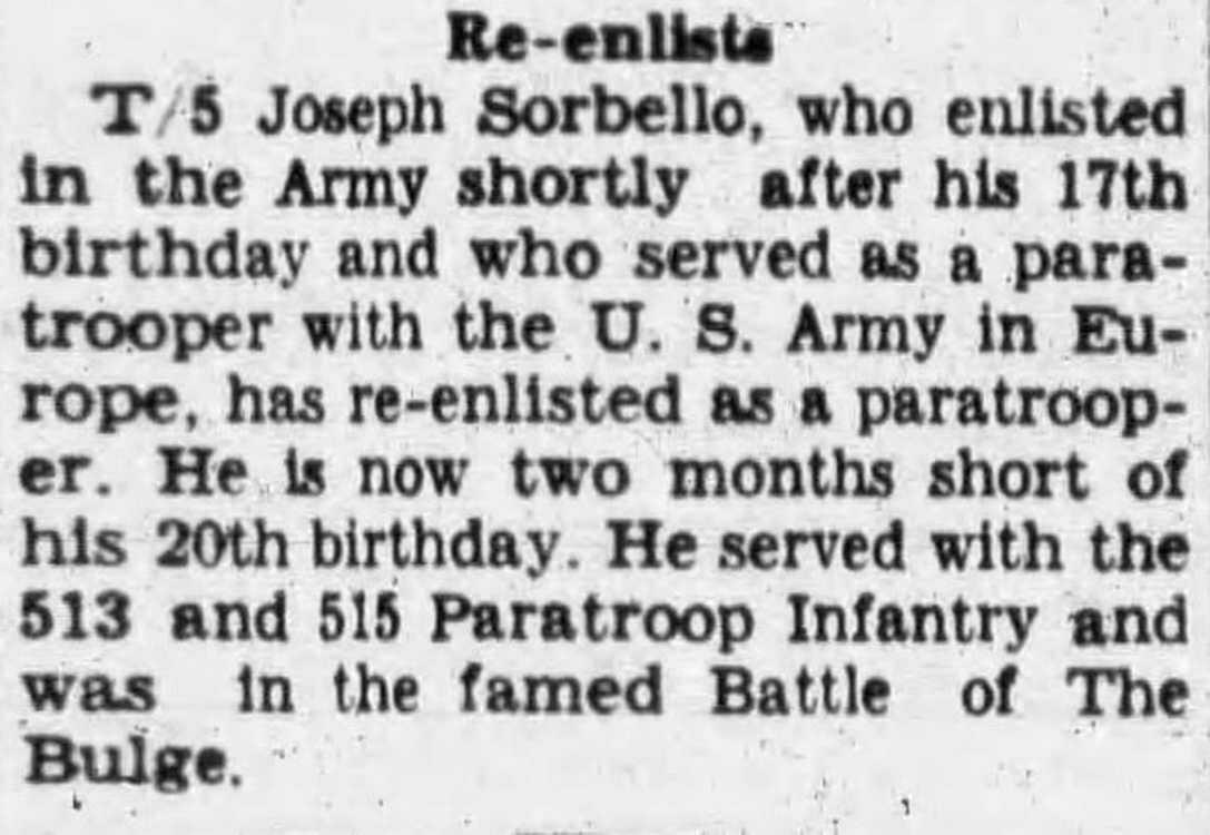 T-5 Joseph Sorbello who enlisted in the Army shortly after his 17th birthday and who served as a paratrooper with the U. 8. Army in Europe has re-enlisted as a paratrooper. He is now two months short of his 20th birthday He served with the 513 and 515 Paratroop Infantry and was In the famed Battle of The Bulge.