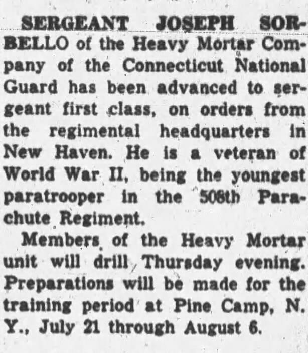 SERGEANT JOSEPH SORBELLO of the Heavy Mortar Company of the Connecticut National Guard has been advanced to sergeant first class on orders from the regimental headquarters in New Haven He is a veteran of World War II being the youngest paratrooper In the 506th Parachute Regiment