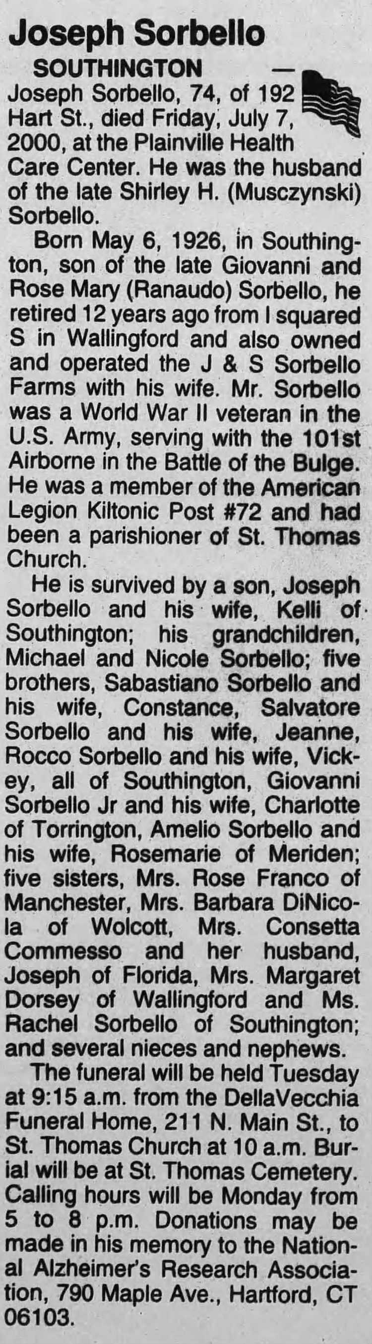 Wallingford. He also owned and operated the J & S Sorbello Farms with his wife. He was a U.S. Army veteran of World War n, serving with the 101st Airborne in the Battle of the Bulge. He was a member of the American Legion Kiltonic Post 72 and had been a parishioner of St. Thomas Church.