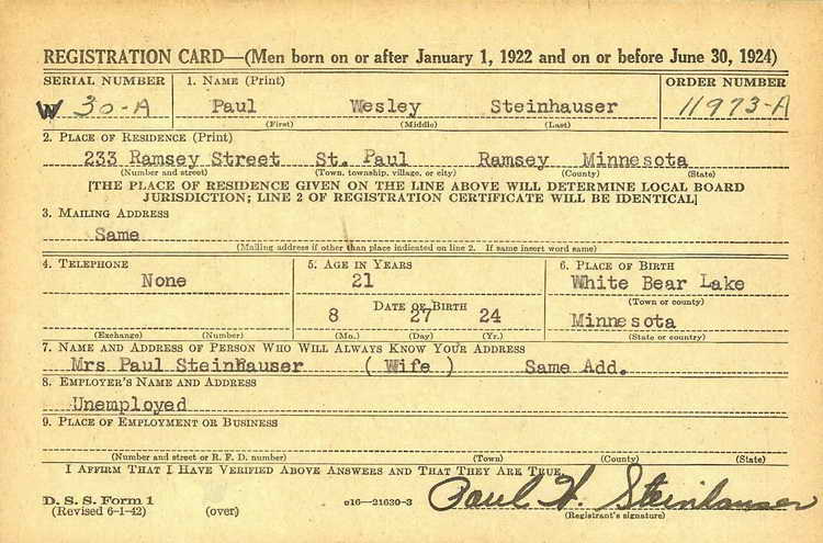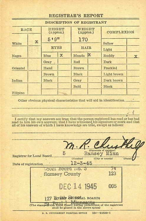 Fort Snelling, MN on 30 September 1942 and may have never registered for the