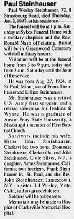 He was born Aug. 27, 1924, in St. Paul, Minn., son of Frank Steinhauser and Lillian Steinhauser. Mr. Steinhauser was a retired U.S. Army first sergeant and a retired salesman for Jenkins & Wynne. He was a graduate of Austin Peay State University, a Mason and a member of First Baptist Church.