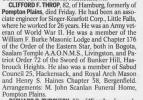 CLIFFORD F. THROP, 82, of Hamburg, formerly of Pompton Plains, died Friday. He had been an associate engineer for Singer-Kearfott Corp., Little Falls, where he worked for 26 years. He was an Army veteran of World War II. He was a member of the William F. Burke Masonic Lodge and Chapter 176 of the Order of the Eastern Star, both in Bogota, Saalam Temple A.A.O.N.M.S.,