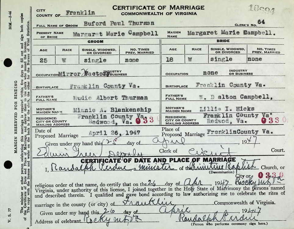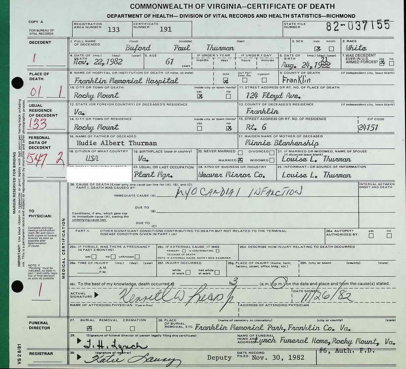 Wedding and death certificates for Buford Paul. Thurman.