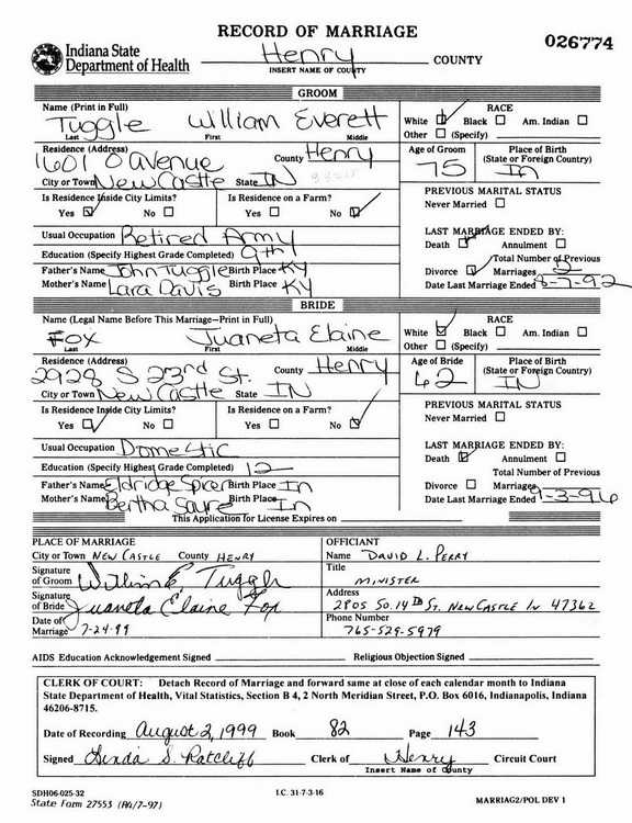 Survivors include his wife, Juaneta; a daughter, Lorene Tuggle Allen, Tacoma, Wash.; two sons, William Jr. and fiance Annie Wise, both of Greensburg, and Loren and wife Judith, Indianapolis; two stepsons, Dale and wife Jeannie Fox, and Delbert Jeffrey Fox, all of New Castle; a granddaughter, Amber Renee and husband Pat Comp, Norfolk, Va.; a step-granddaughter, Cassie Perdew, Indianapolis; three stepgrandsons, Josh, Travis and Sam Fox, all of New Castle; two great-grandchildren, Brandon and McKinsey Comp, both of Norfolk, Va.; two sisters, Ethel Jones and Marge York, both of New Castle; a sister-in-law, Nell Tuggle, Monticello, Ky.; and several nieces and nephews.