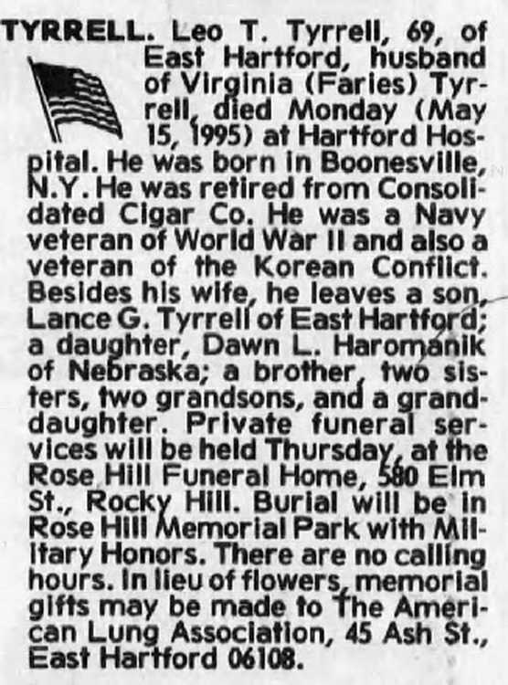 Besides his wife, he leaves a son, Lance G. Tyrrell of East Hartford; a daughter. Dawn L. Haromanlk of Nebraska; a brother, two sisters, sisters, two grandsons, and a granddaughter.