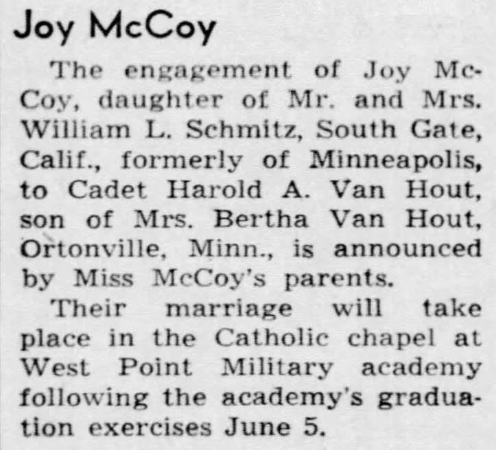 Mrs., William L. Schmitz, South Gate, Calif., formerly of Minneapolis, to Cadet Harold A. Van Hout, son of Mrs. Bertha Van Hout, Ortonville, Minn., is announced by Miss McCoy's parents.