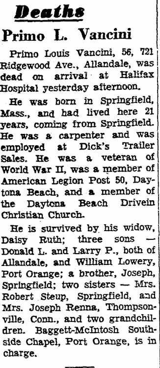 Primo Louis Vancini, 56, '721 Ridgewood Ave, Allandale, was dead on arrival · at Halifax Hospital yesterday afternoon.