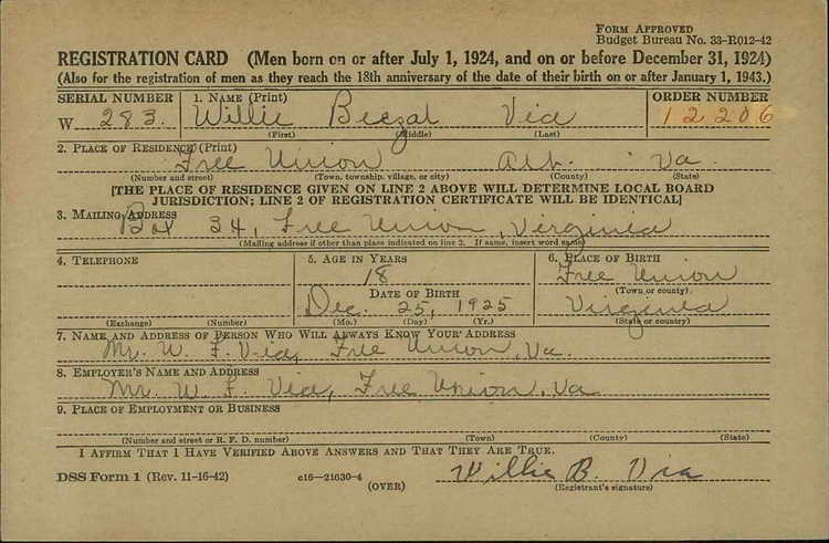 VIA, Willie "Billy" Beezal, 89, of Richmond, joined his wife in heaven on January 9, 2015, surrounded by his loving family. He was preceded in death by his wife, Viola Fern Davis Via; siblings, Mary Lentz (Elmer), Frances Wood , Lavert Via, Margaret Nicholson (Nick), Emmett Via and Vuluvian Via (Reba).