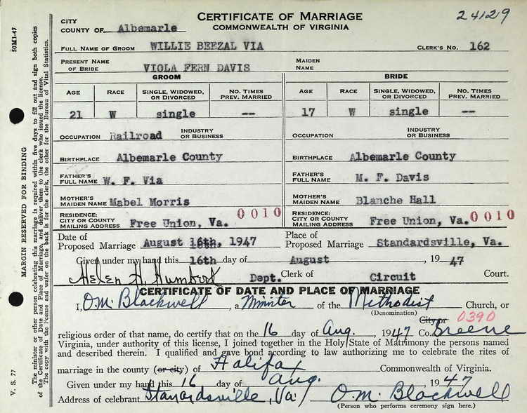 married Viola Fern Davis [1930–2012] in Stanardsville (Greene county),