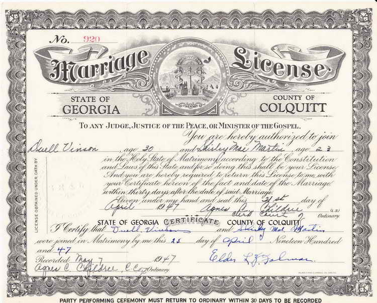 married Shirley Mae Martin [1923–2010] in Colquitt county, GA on 25