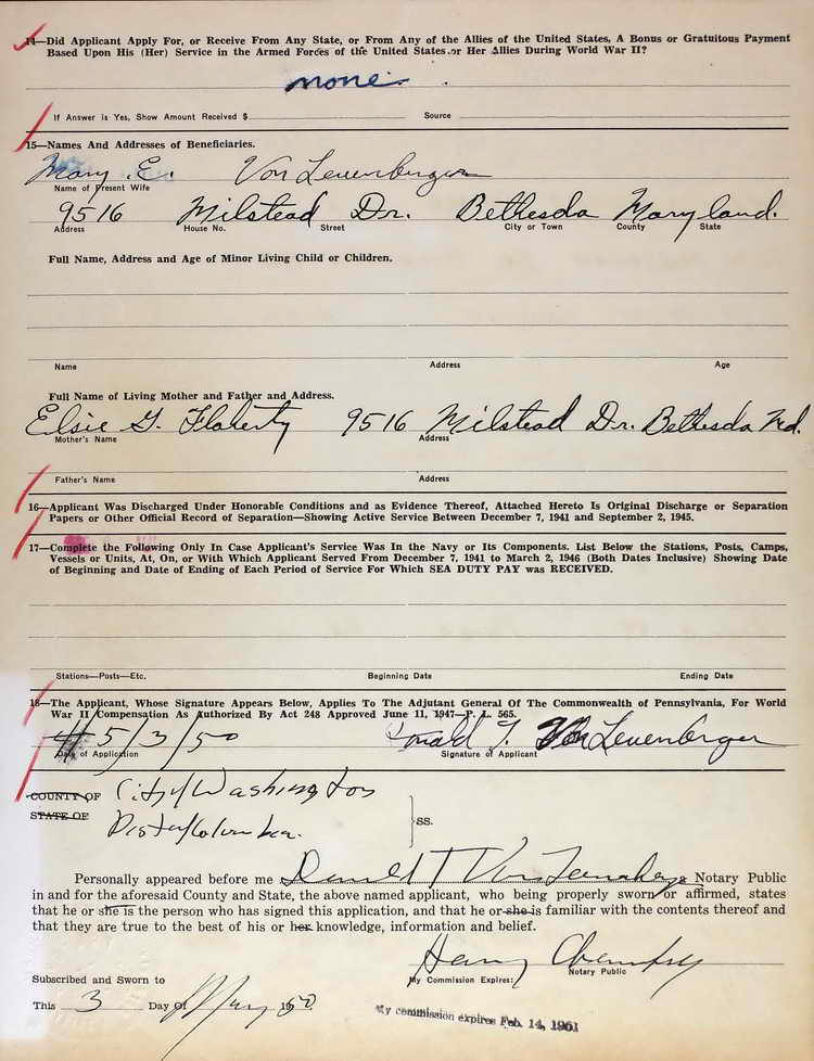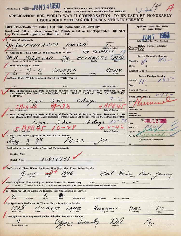 Pennsylvania WWII Veterans Bonus application for Donald T.