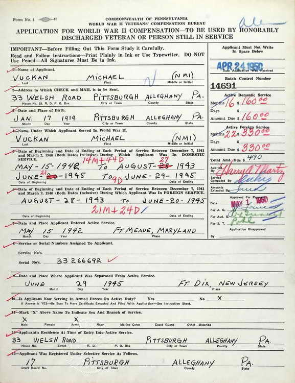 application for the Pennsylvania WWII Veterans bonus on 1 February 1950.