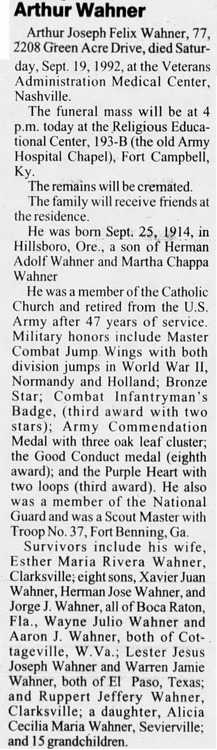 Arthur Joseph Felix Wahner, 77, 2208 Green Acre Drive, died Saturday, Sept. 19, 1992, at the Veterans Administration Medical Center, Nashville. The funeral mass will be at 4 p.m. today at the .Religious Educational Center, 193-B (the old Army Hospital Chapel), Fort Campbell, Ky. The remains will be cremated. The family will receive friends at the residence. He was born Sept. 25, 1914, in Hillsboro, Ore., a son of Herman Adolf Wahner and Martha Chappa Wahner He was a member of the Catholic Church and retired from the U.S. Army after 47 years of service. Military honors include Master Combat Jump. Wings with both division jumps in World War II, Normandy and Holland; Bronze Star; Combat Infantryman's Badge, (third award with two stars); Army Commendation Medal with three oak leaf cluster; the Good Conduct medal (eighth award); and the Purple Heart with two loops (third award). He also was a member of the National Guard and was a Scout Master with Troop No. 37, Fort Benning, Ga. Survivors include his wife, Esther Maria Rivera Wahner, Clarksville; eight sons, Xavier Juan Wahner, Herman Jose Wahner, and Jorge J. Wahner, all of Boca Raton, Fla., Wayne Julio Wahner and Aaron J. Wahner, both of Cottageville, W.Va.; Lester Jesus Joseph Wahner and Warren Jamie Wahner, both of El Paso, Texas; and Ruppert Jeffery Wahner, Clarksville; a daughter, Alicia Cecilia Maria Wahner, Sevierville; and 15 grandchildren.