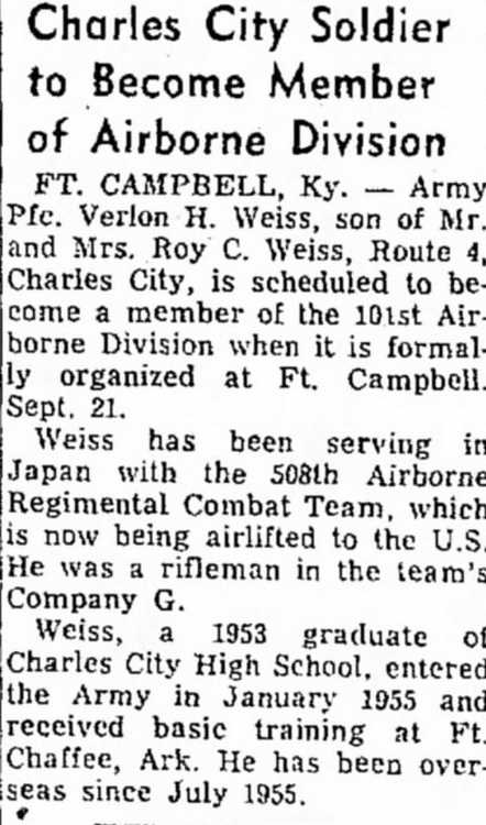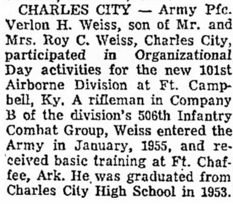 CHARLES CITY — Army Pfc. Verlon H. Weiss, son of Mr. and Mrs. Roy C. Weiss, Charles City, participated in Organizational Day activities for the new 101st Airborne Division at Ft. Campbell, Ky. A rifleman in Company B of the division's 506th Infantry Combat Group, Weiss entered the Army in January, 1955, and received basic training at Ft. Chaffee, Ark. He. was graduated from Charles City High School in 1953