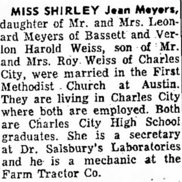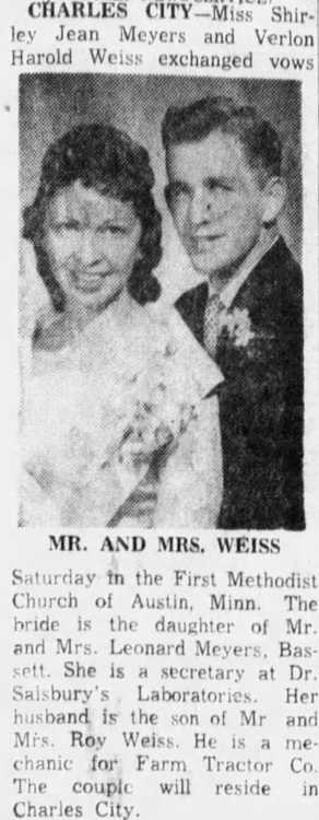 MISS SHIRLEY Jean Meyers, daughter of Mr. and Mrs. Leonard Meyers of Bassett and Verlon Harold Weiss, son of Mr. and Mrs. Roy. Weiss of Charles City, were married in the First Methodist - Church at Austin. They are living in Charles City where both are employed. Both are Charles City High School graduates. She is a secretary at Dr. Salsbury's Laboratories and he is a mechanic at the Farm Tractor Co.