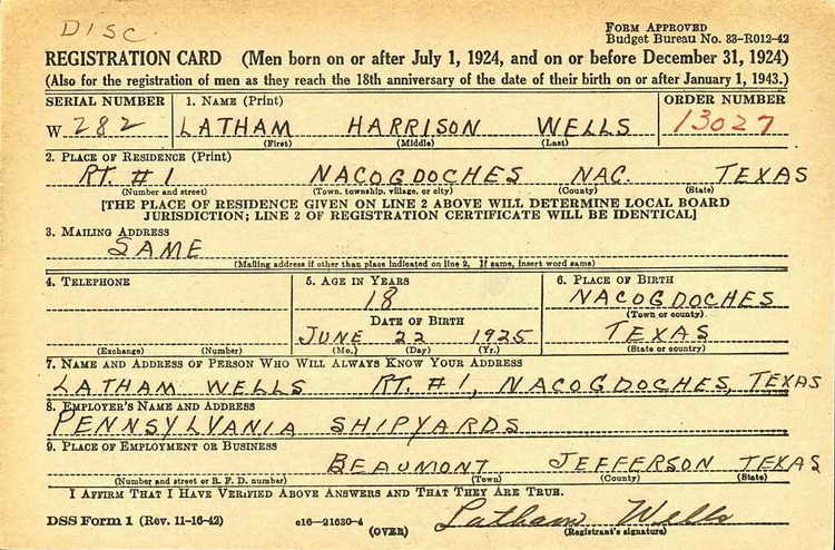 He was born to Latham and Virgie Nix Wells in Nacogdoches County June 22, 1925. He was a Methodist. Mr. Wells attended Central Heights schools, graduating in the 1943 class.