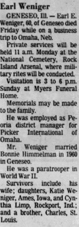 GENESEO, III Earl E. Weniger, 60, of Geneseo died Friday while on a business trip to Omaha, Neb.