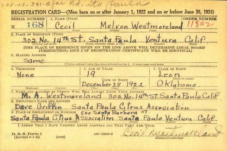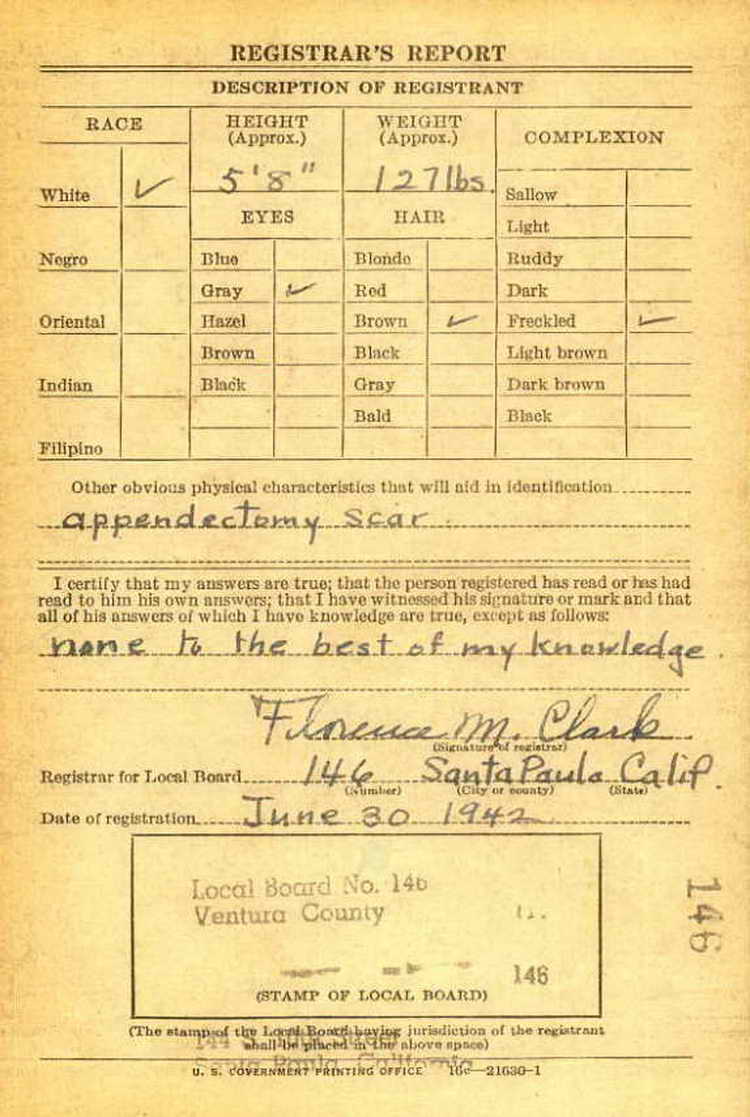 CA on 30 June 1942 and was inducted into the Army at Los Angeles, CA on 17